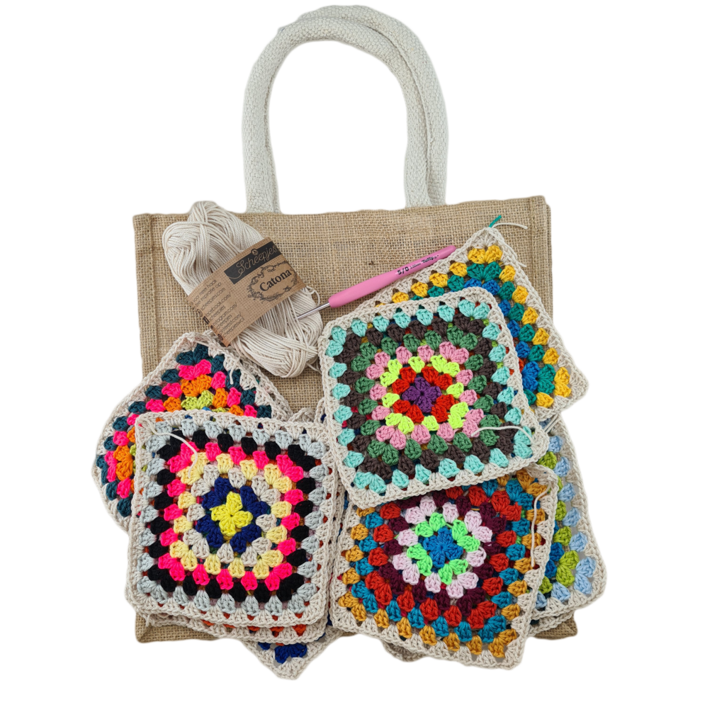 Create a unique and durable bag by crocheting granny squares around a burlap bag! Learn how to use this classic crochet technique to make a practical and fashionable bag. Follow this step-by-step tutorial and choose your favorite yarn colors to create your own bag. You crochet around a jute bag, which gives your bag extra strength and a unique look at the same time. Crochet your own bag with granny squares and let your creativity run wild!